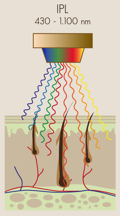 Bei IPL arbeiten wir mit der Streukraft des Lichts: Hochenergetische Blitzlampen mit einem sehr breiten Spektrum an Wellenlängen kommen zum Einsatz. Je nach Wellenlänge kann dringt das Licht unterschiedlich tief in die Haut ein und wirkt so in allen Hautebenen. Dadurch kann SHR auch unliebsame Hauterscheinungen wie Pigmentflecken, Gefäßstörungen und Nagelpilz lindern.